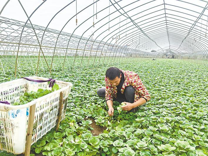 11月11日上午,武汉市东西湖区强鑫蔬菜产销合作社种植大棚内,员工何超正在采收小白菜。(湖北日报全媒记者 魏萌叶 摄)