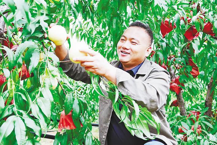 孝丰生态农业科技有限公司负责人魏恒喜摘丰山桃。(受访单位供图)