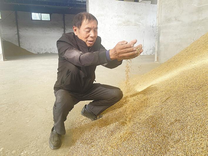 蕲春粮农范成美捧起今年新收的稻谷。(湖北日报全媒记者 汪彤 摄)