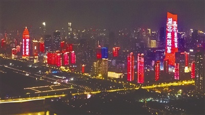 11月13日晚,武汉两江四岸的灯光秀闪耀着“湖北是冠军”,祝贺湖北男足获得全运会金牌。楚天都市报极目新闻记者任勇摄