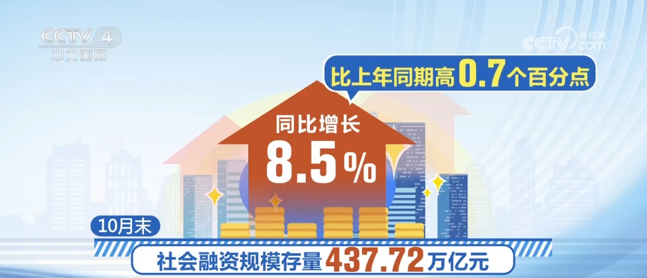 央视网消息:11月13日,中国人民银行发布10月金融数据。10月,社会融资规模增速保持在较高水平,持续为经济回升向好创造适宜的货币金融环境。