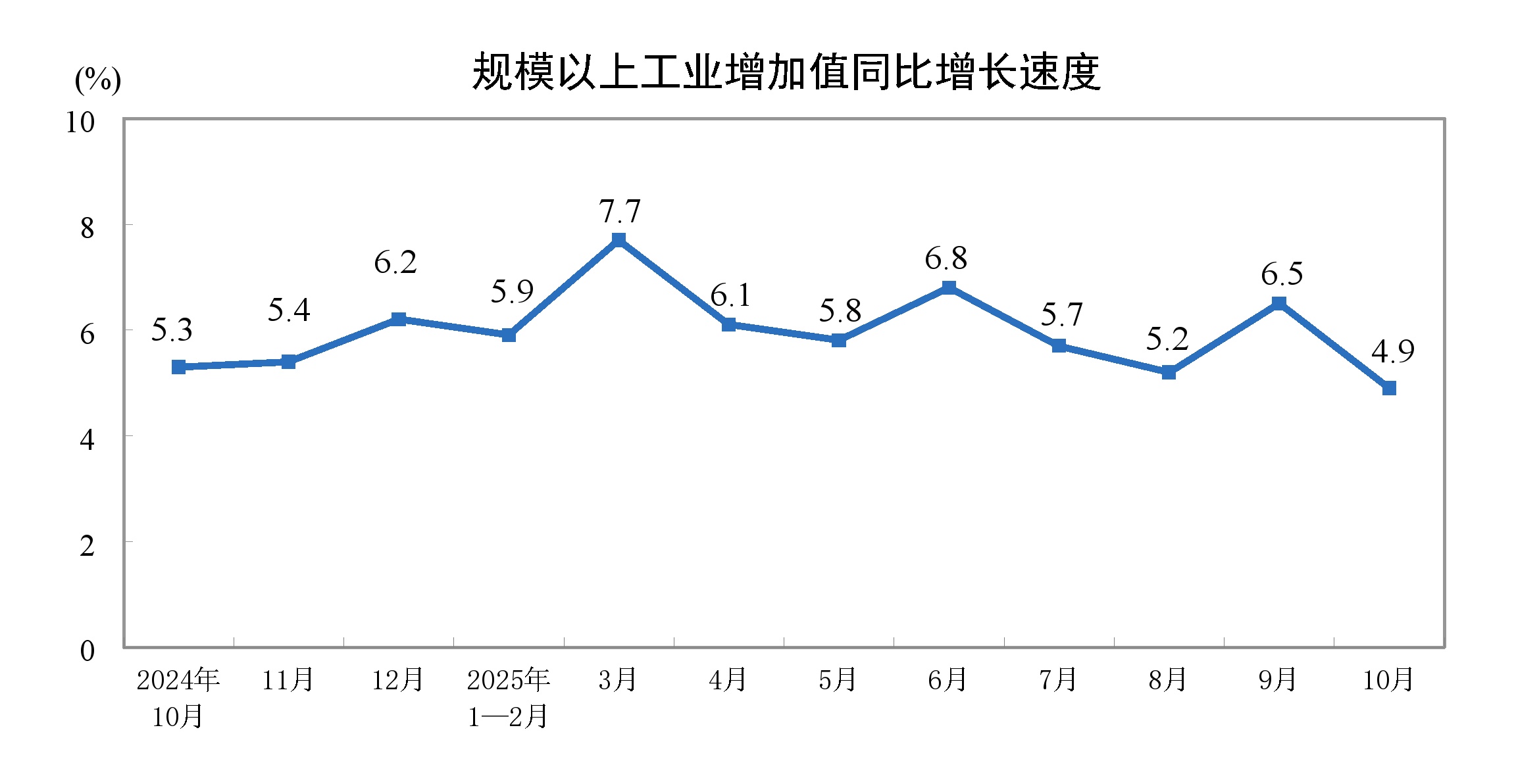 央视网消息:据国家统计局网站消息,10月份,规模以上工业增加值同比实际增长4.9%(增加值增速均为扣除价格因素的实际增长率)。从环比看,10月份,规模以上工业增加值比上月增长0.17%。1—10月份,规模以上工业增加值同比增长6.1%。
