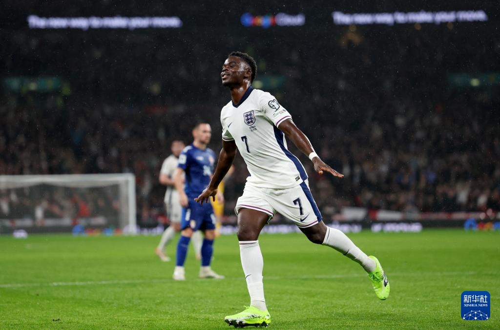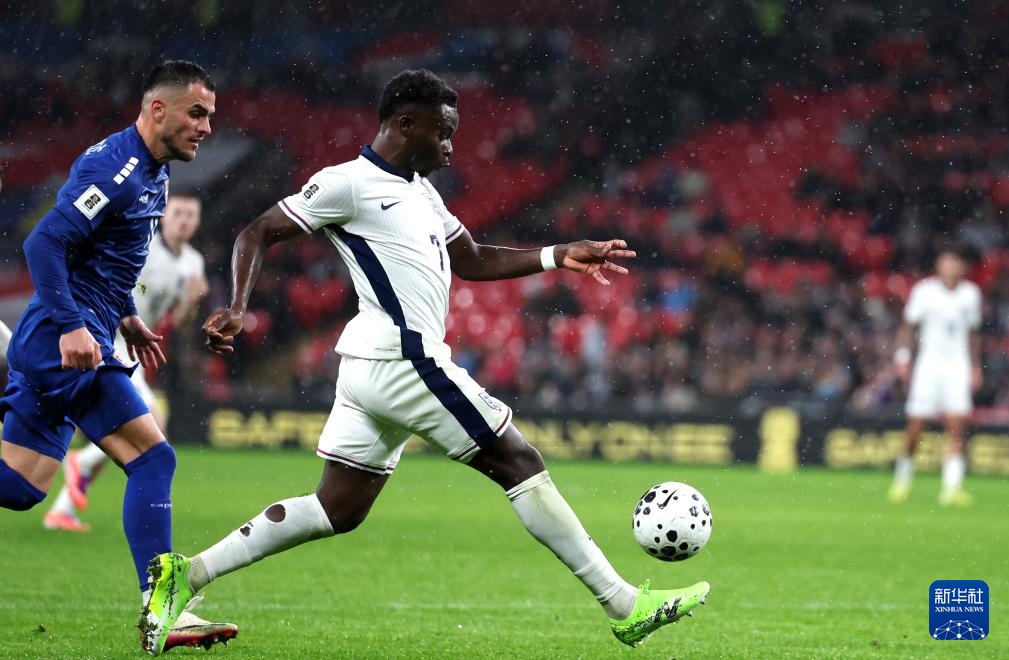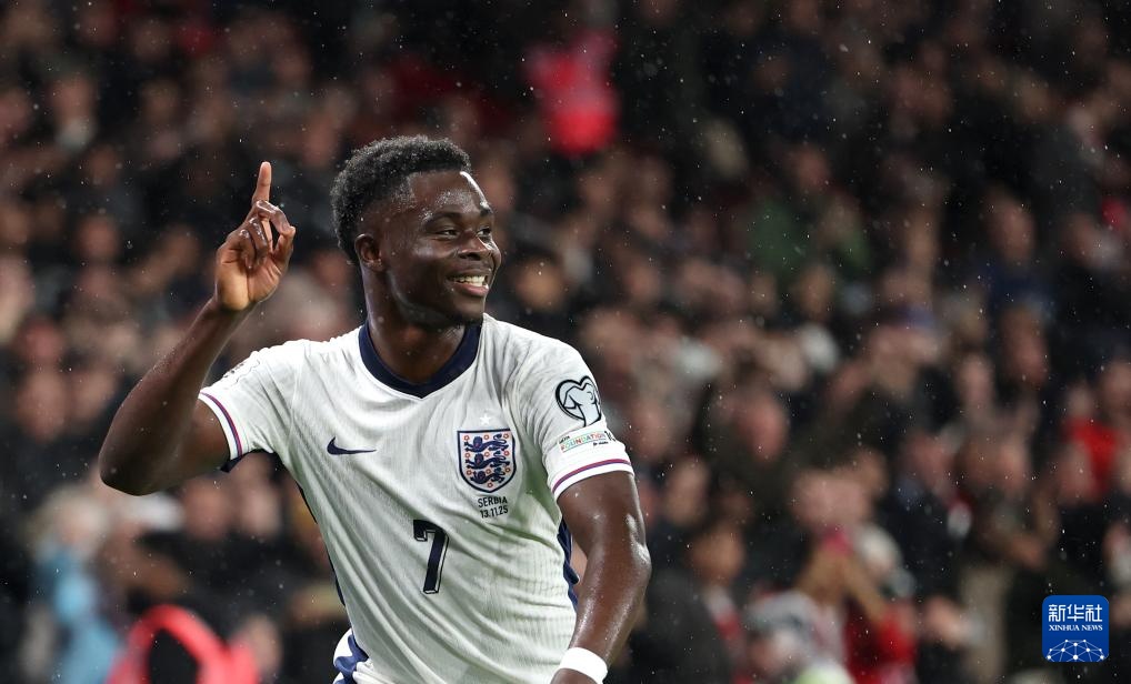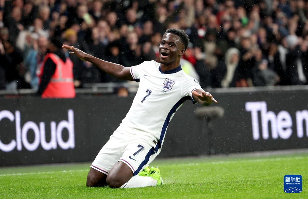 11月13日,英格兰队球员萨卡在比赛中庆祝进球。