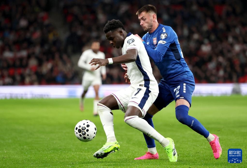 11月13日,英格兰队球员萨卡(左)与塞尔维亚队球员卡泰在比赛中拼抢。