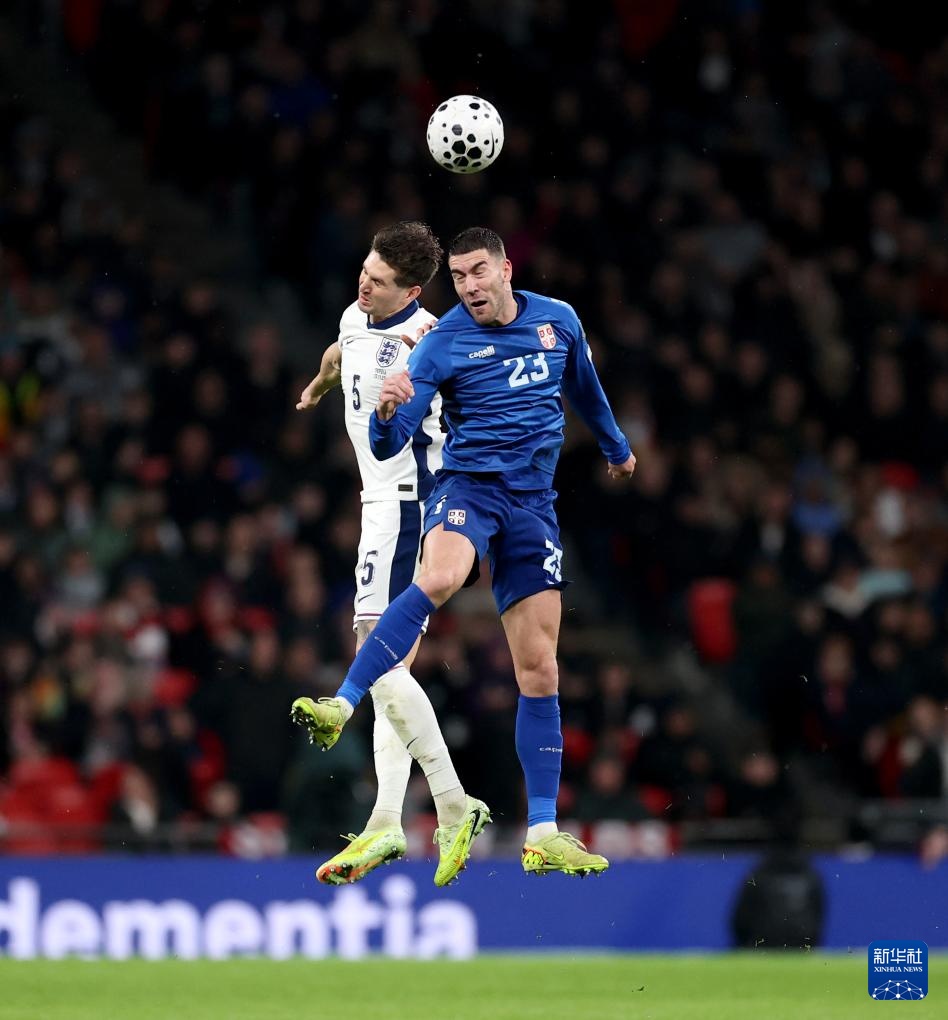 11月13日,英格兰队球员斯通斯(左)与塞尔维亚队球员弗拉霍维奇在比赛中争顶。