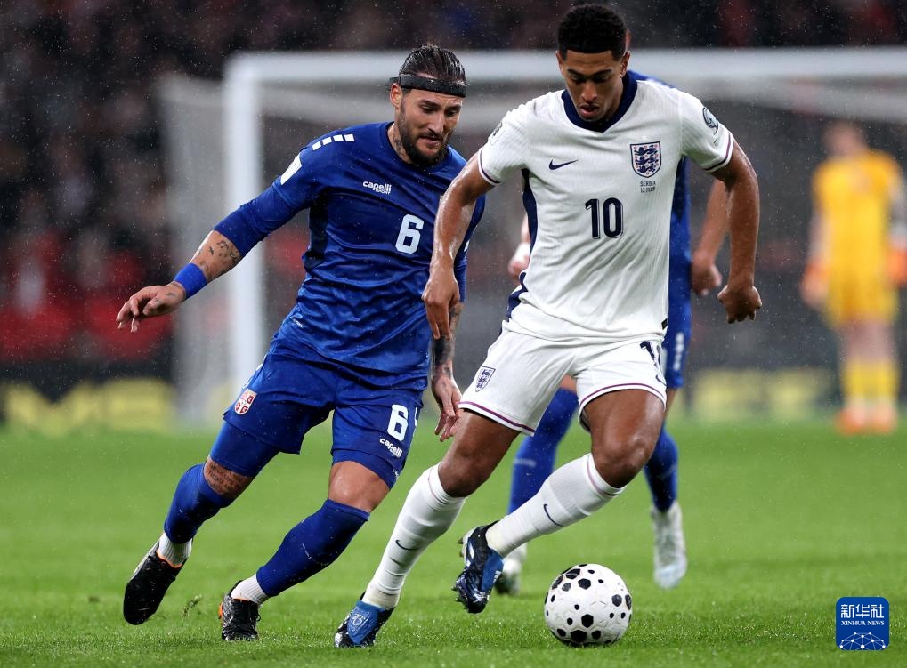11月13日,英格兰队球员贝林厄姆(右)与塞尔维亚队球员古德利在比赛中拼抢。