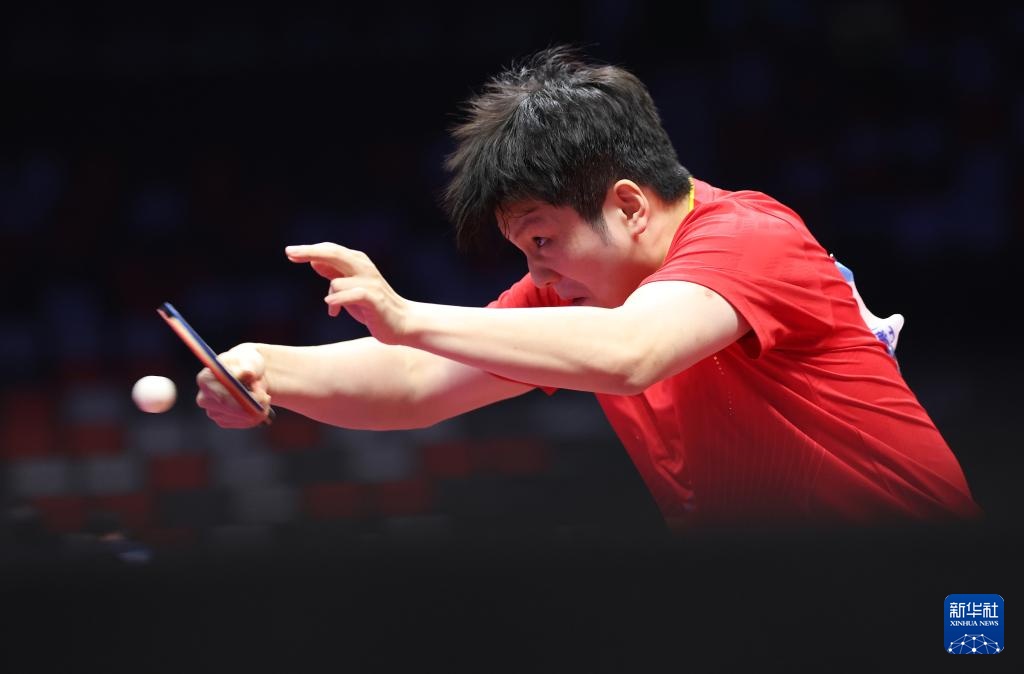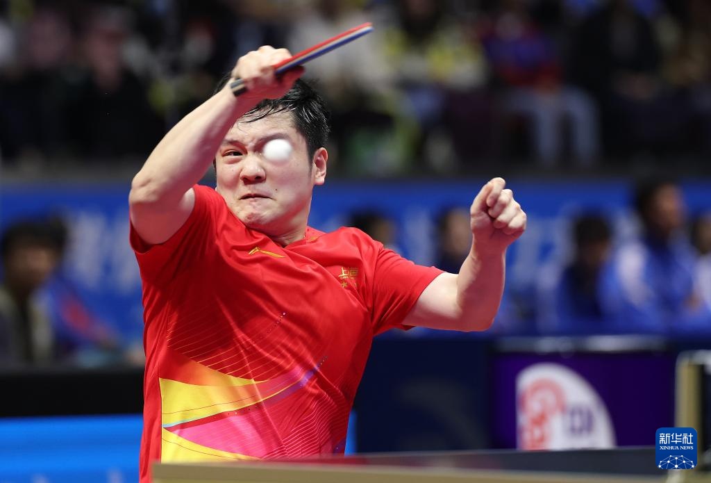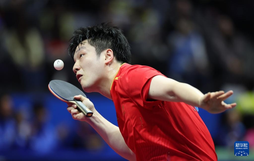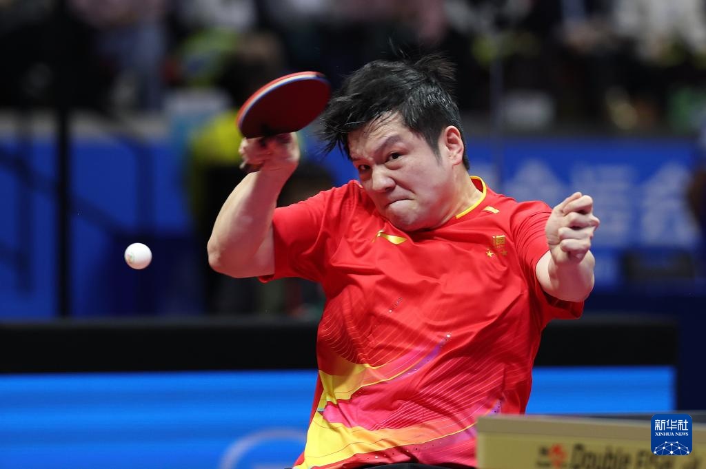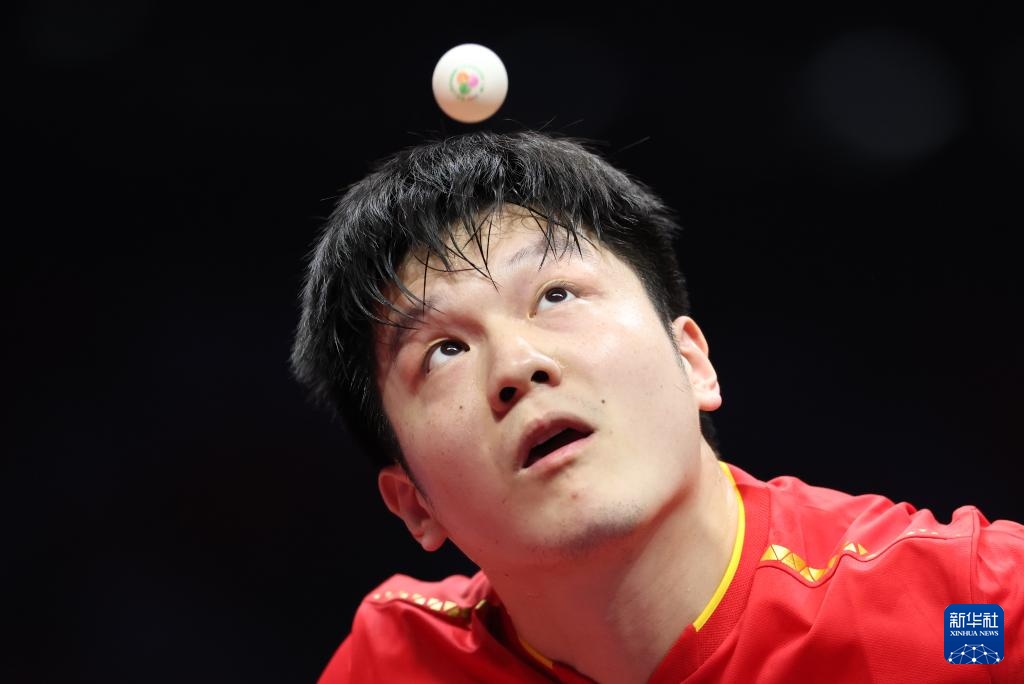 11月14日,上海队选手樊振东在比赛中回球。他在单打比赛中对阵江苏队选手孙闻。