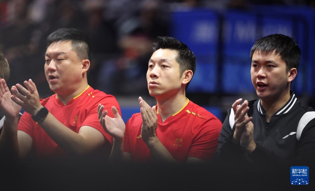 11月14日,上海队选手许昕(中)在比赛中为场上队友加油。