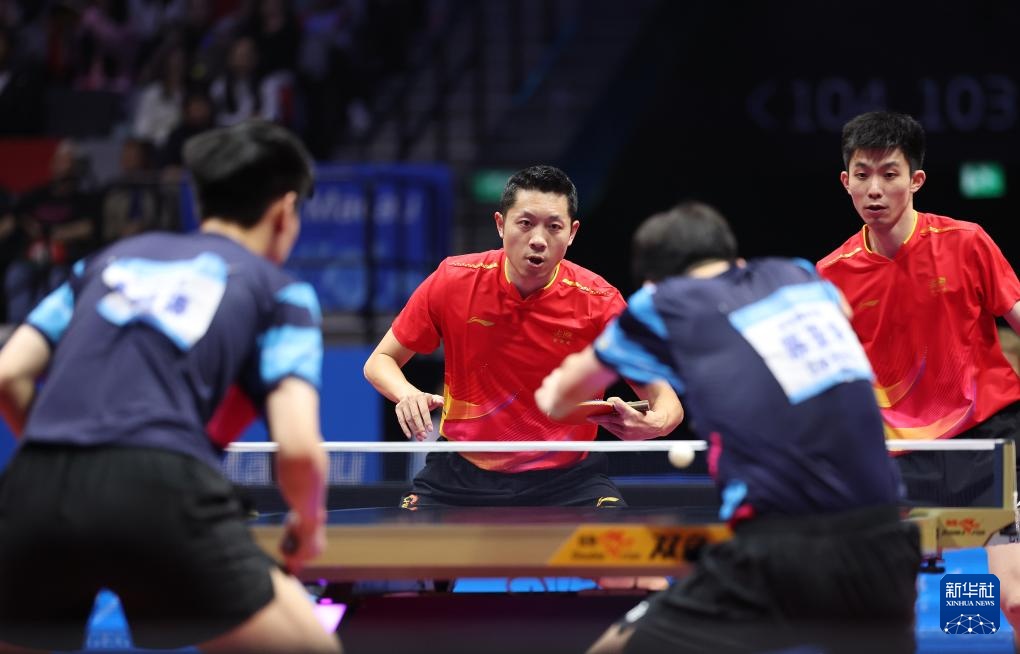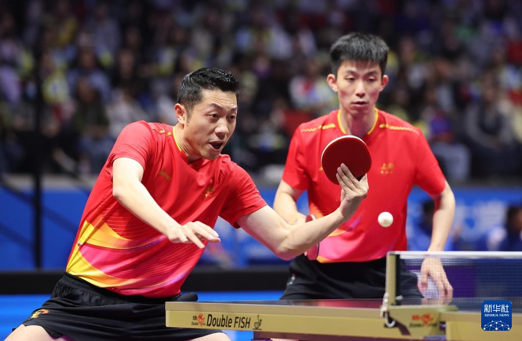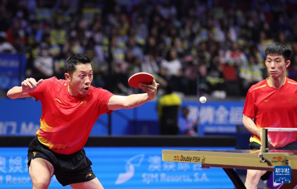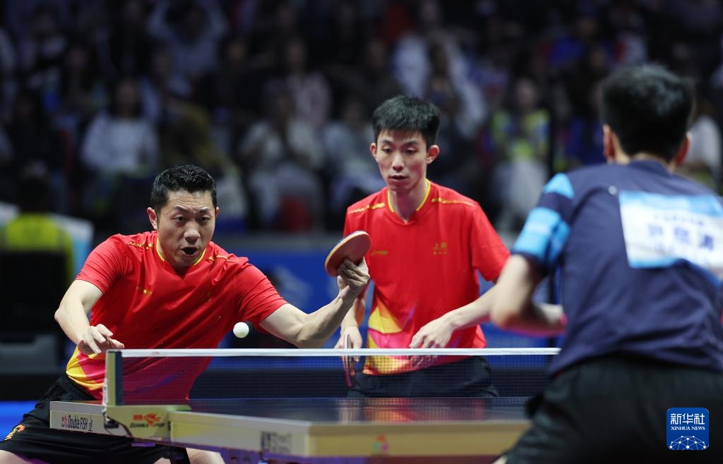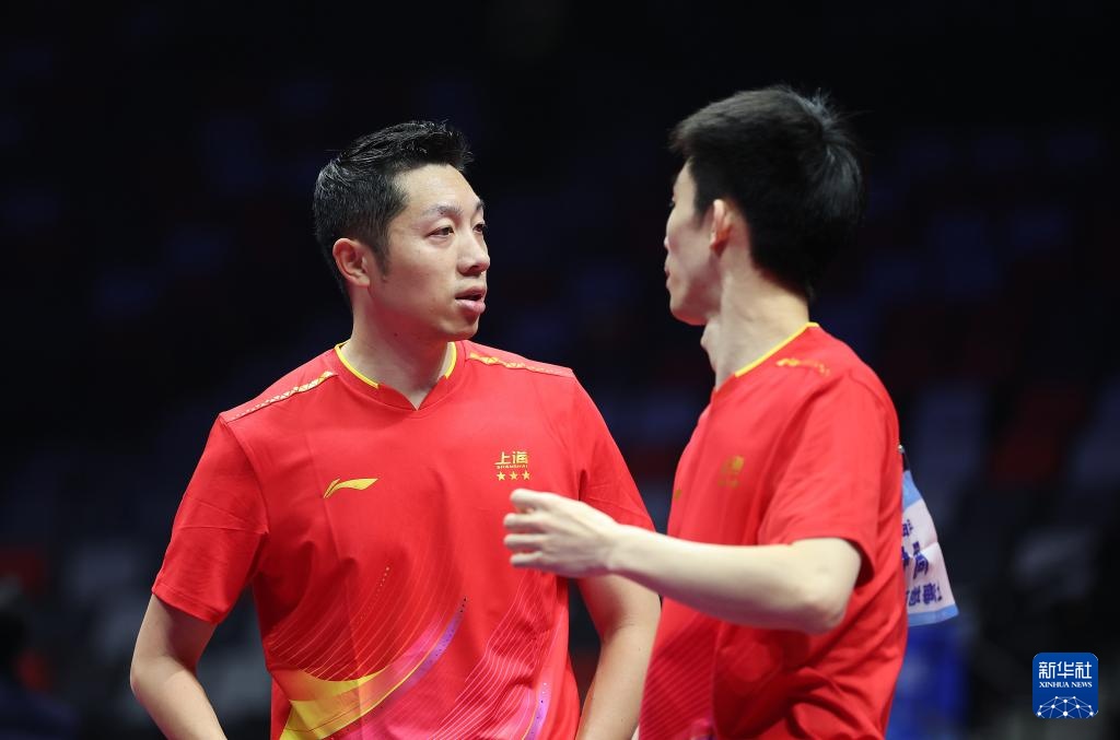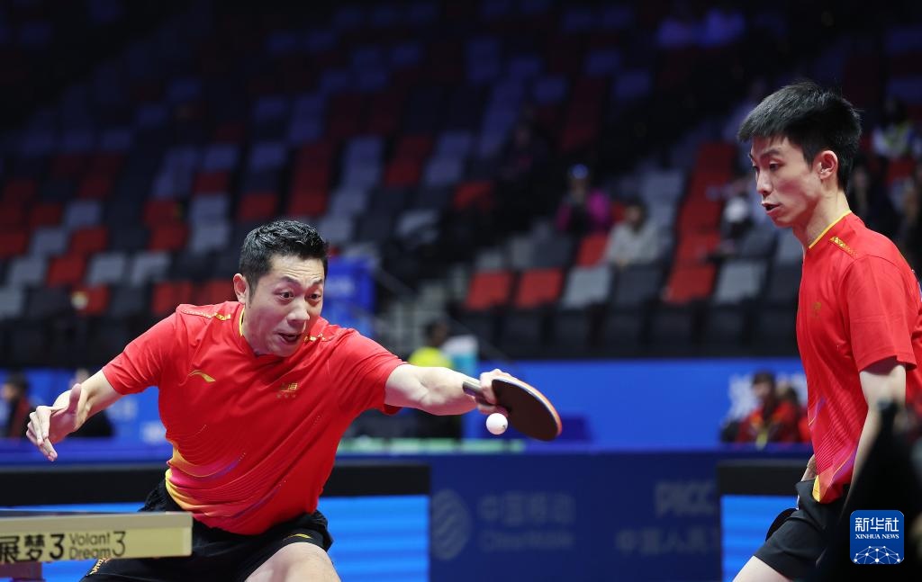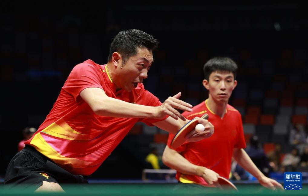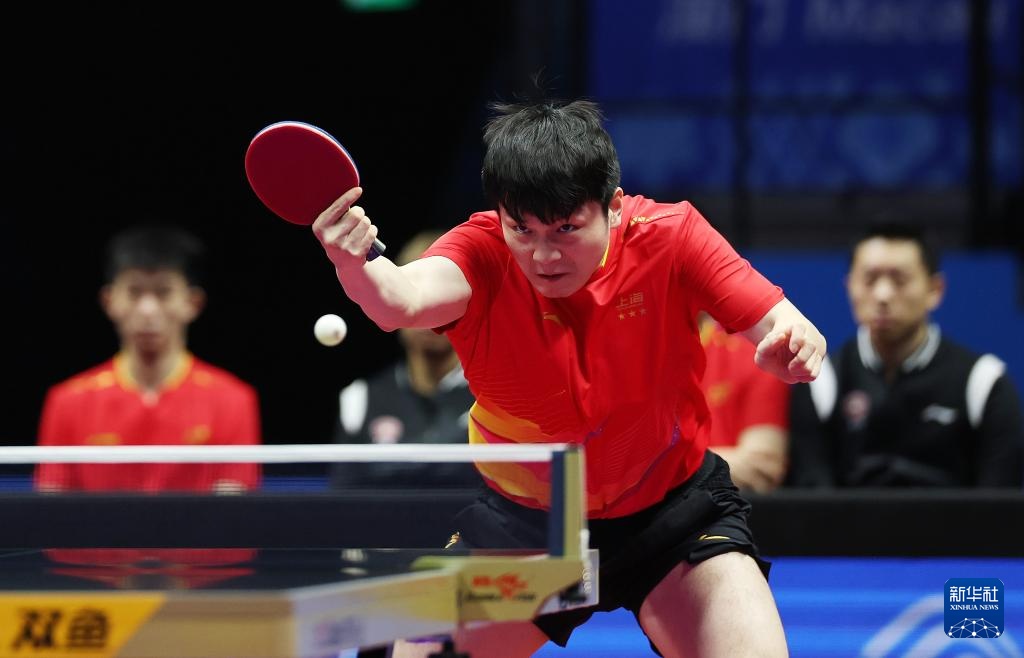 11月14日,上海队组合周恺/许昕(左)在比赛中。他们在双打比赛中3比1战胜江苏队组合曹彦涛/陈亚轩。