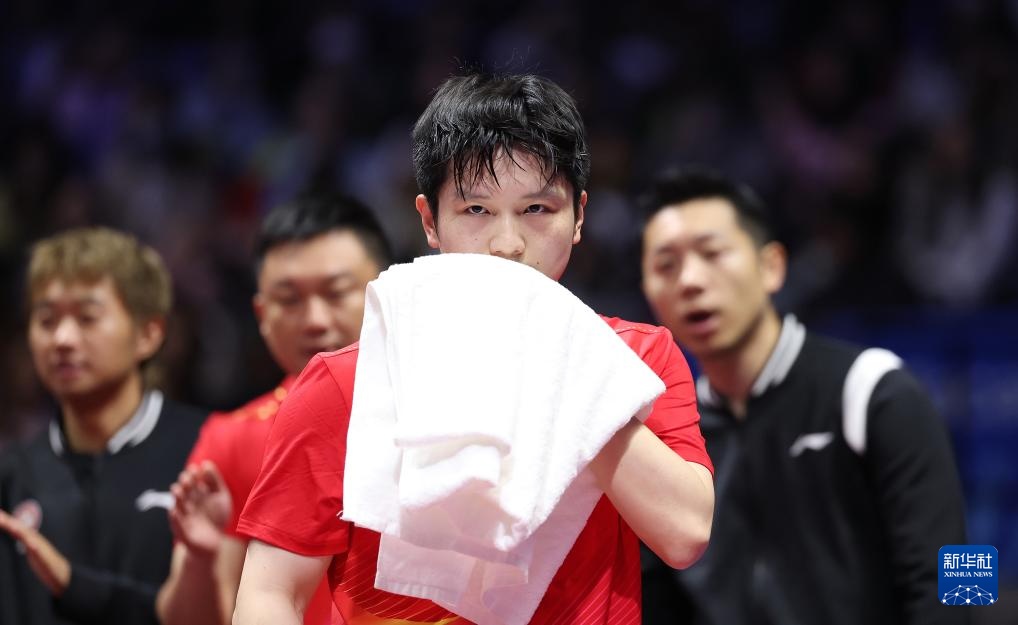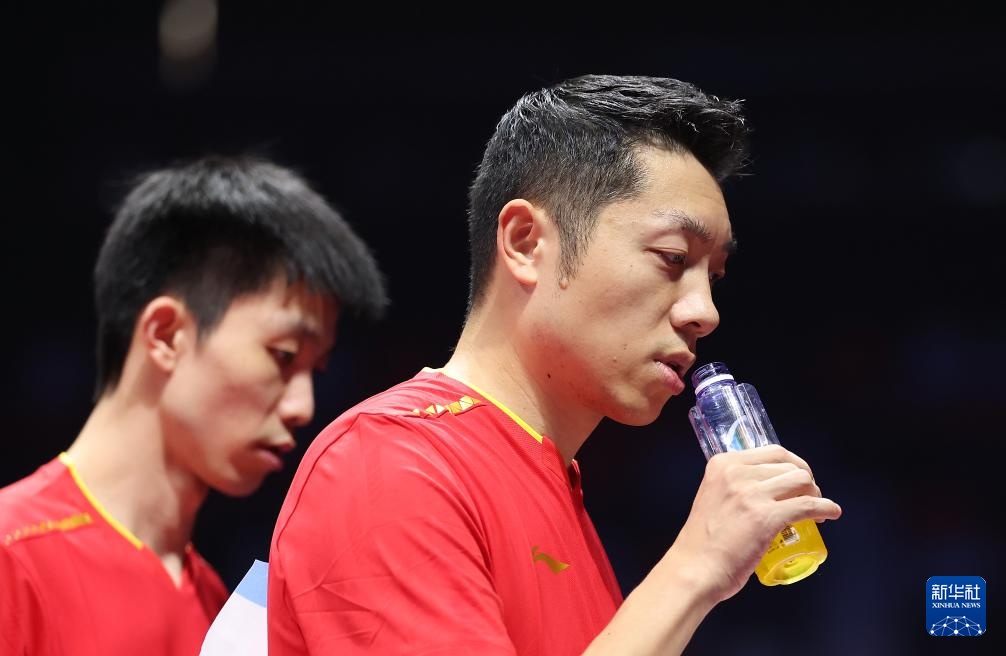 11月14日,上海队组合周恺/许昕(右)在比赛间隙喝水。他们在双打比赛中3比1战胜江苏队组合曹彦涛/陈亚轩。