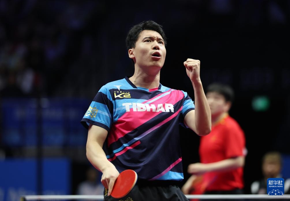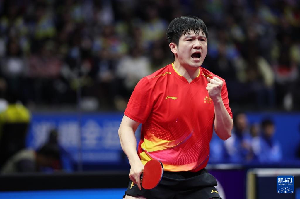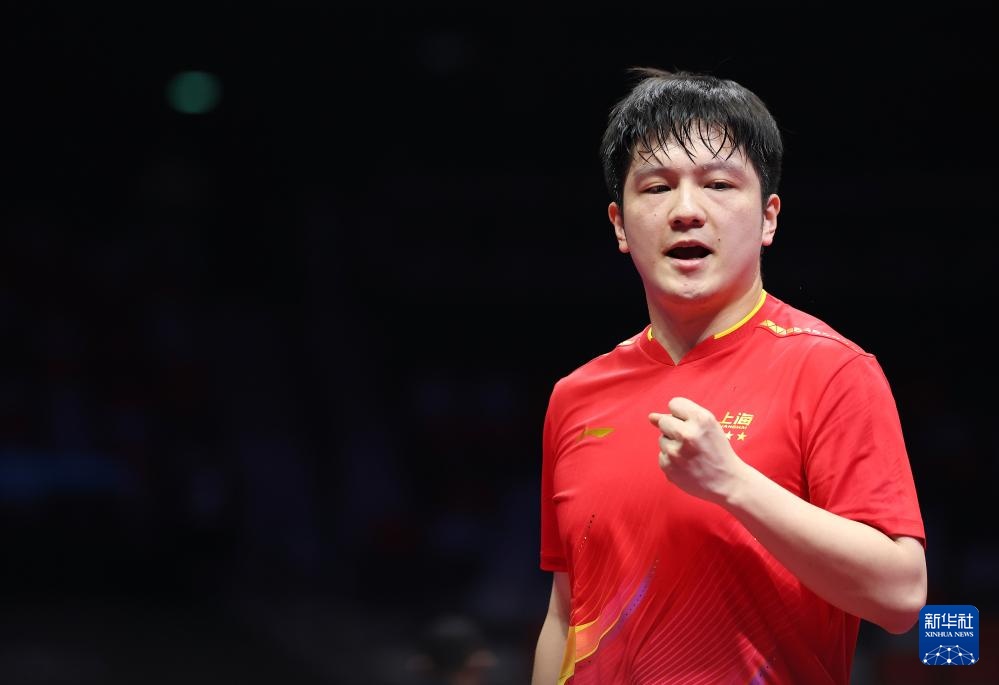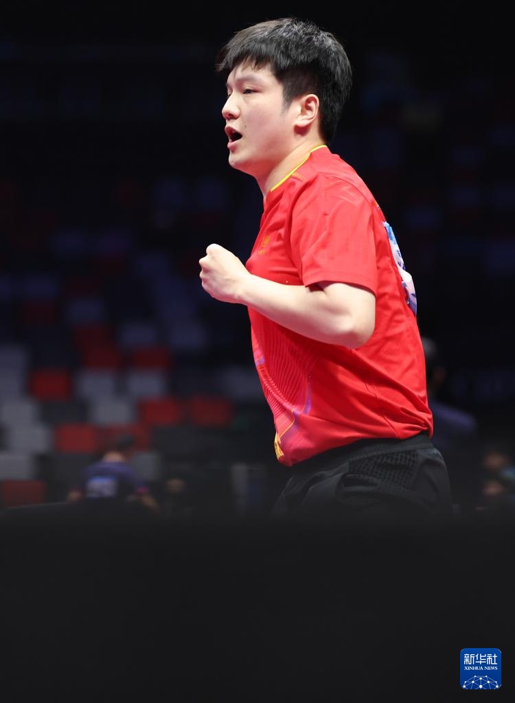 11月14日,上海队选手樊振东在比赛中庆祝得分。