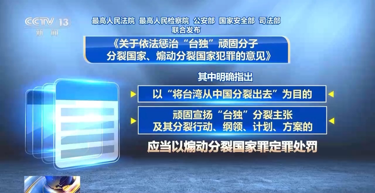 2024年6月,最高人民法院、最高人民检察院、公安部、国家安全部、司法部联合发布关于依法惩治“台独”顽固分子分裂国家、煽动分裂国家犯罪的意见,对煽动分裂国家罪的具体情形作出明确规定。其中明确指出:以“将台湾从中国分裂出去”为目的,顽固宣扬“台独”分裂主张及其分裂行动、纲领、计划、方案的,应当以煽动分裂国家罪定罪处罚。