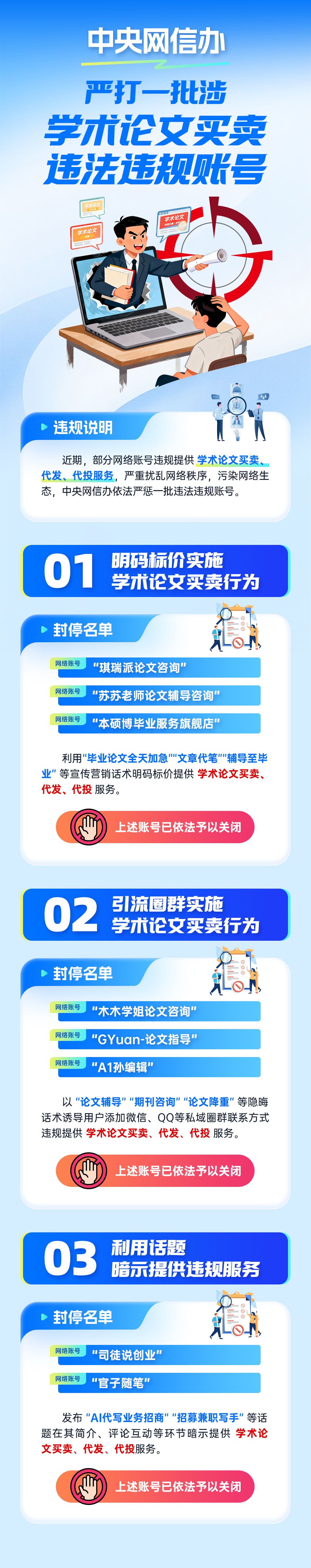 近期,部分网络账号违规提供学术论文买卖、代发、代投服务,严重扰乱网络秩序,污染网络生态,中央网信办依法严惩一批违法违规账号。