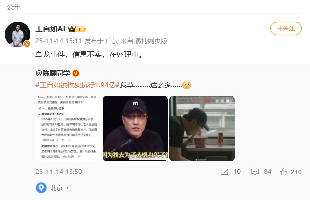 11月14日,王自如发文辟谣被恢复执行1.94亿元。