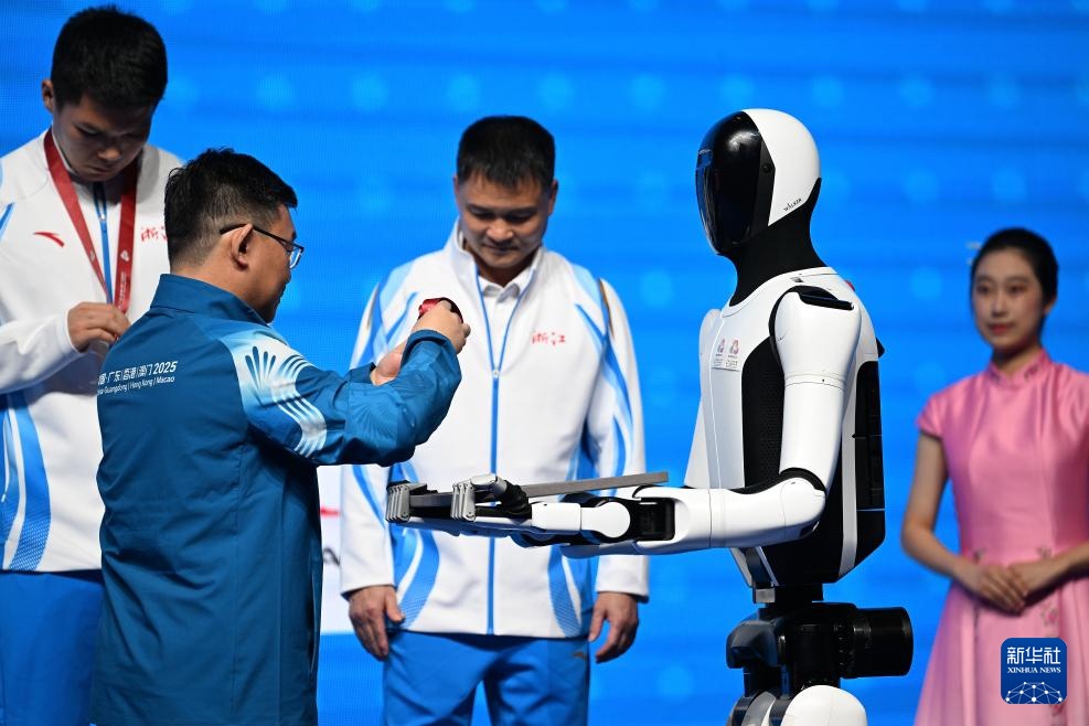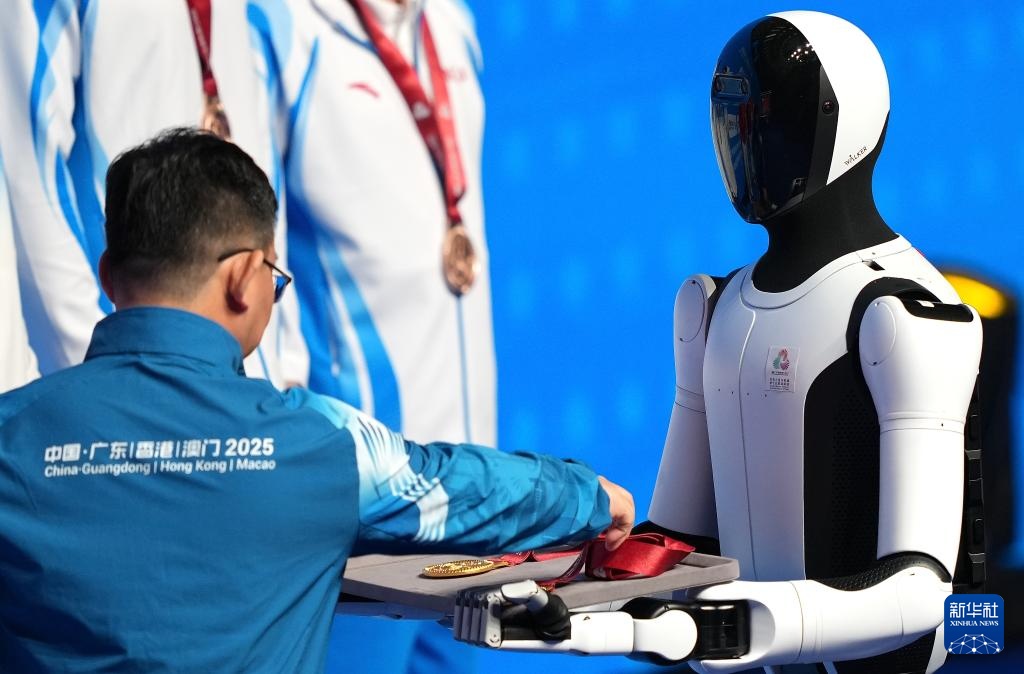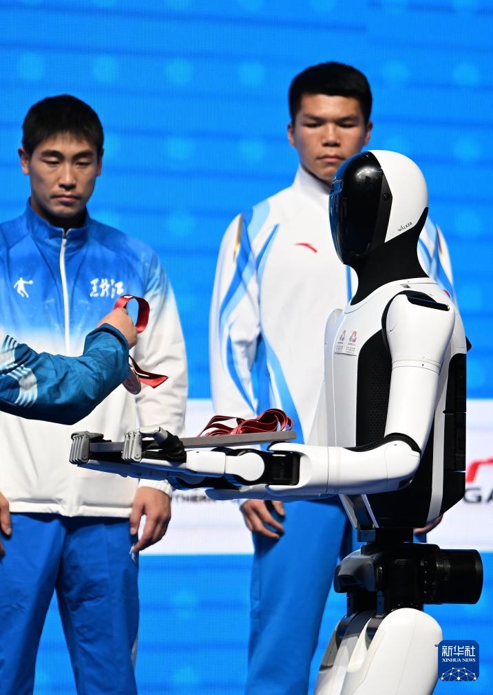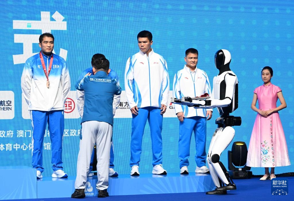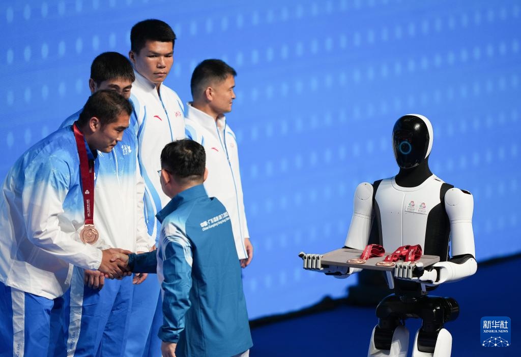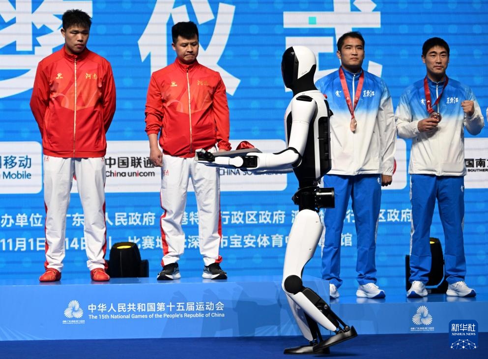 当日,人形机器人亮相第十五届全国运动会拳击男子92公斤级颁奖仪式。