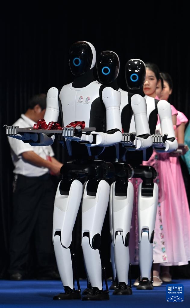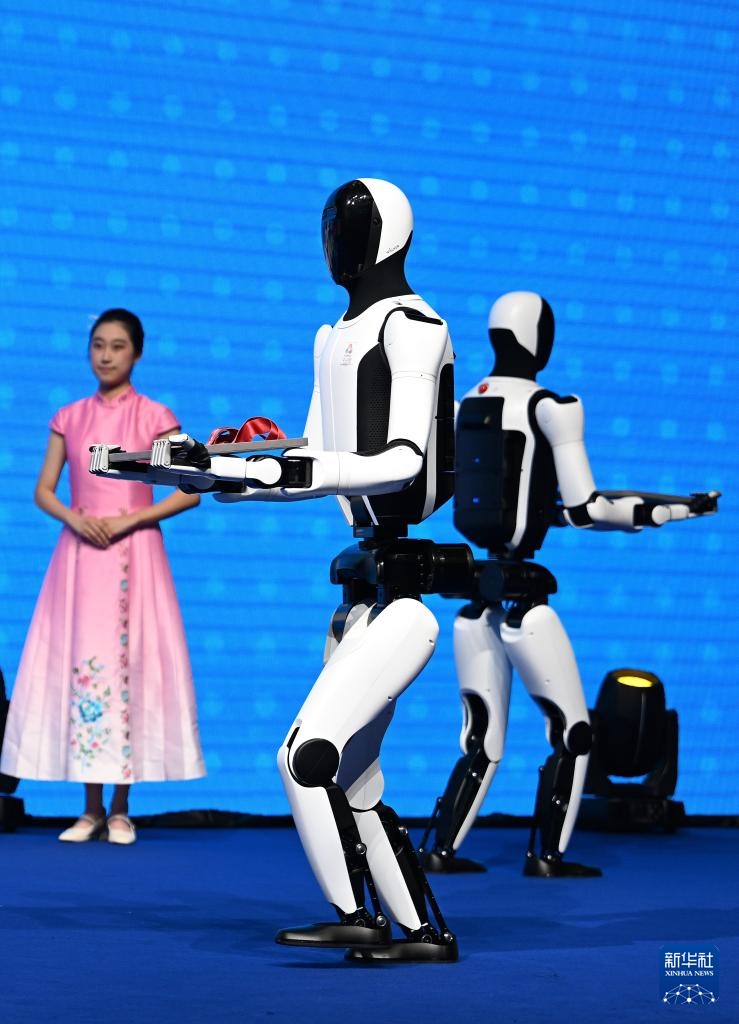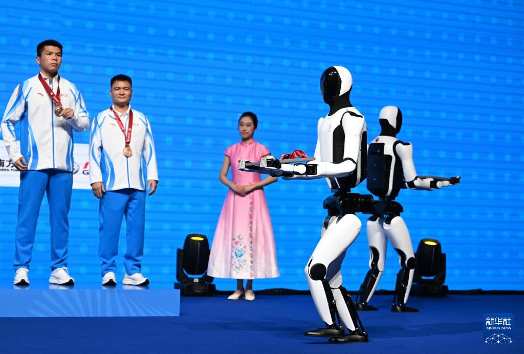11月14日,人形机器人在颁奖仪式上为颁奖嘉宾递上奖牌。