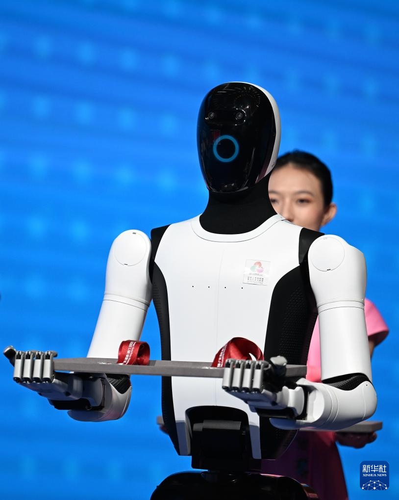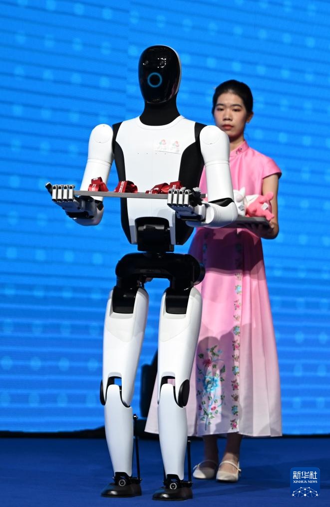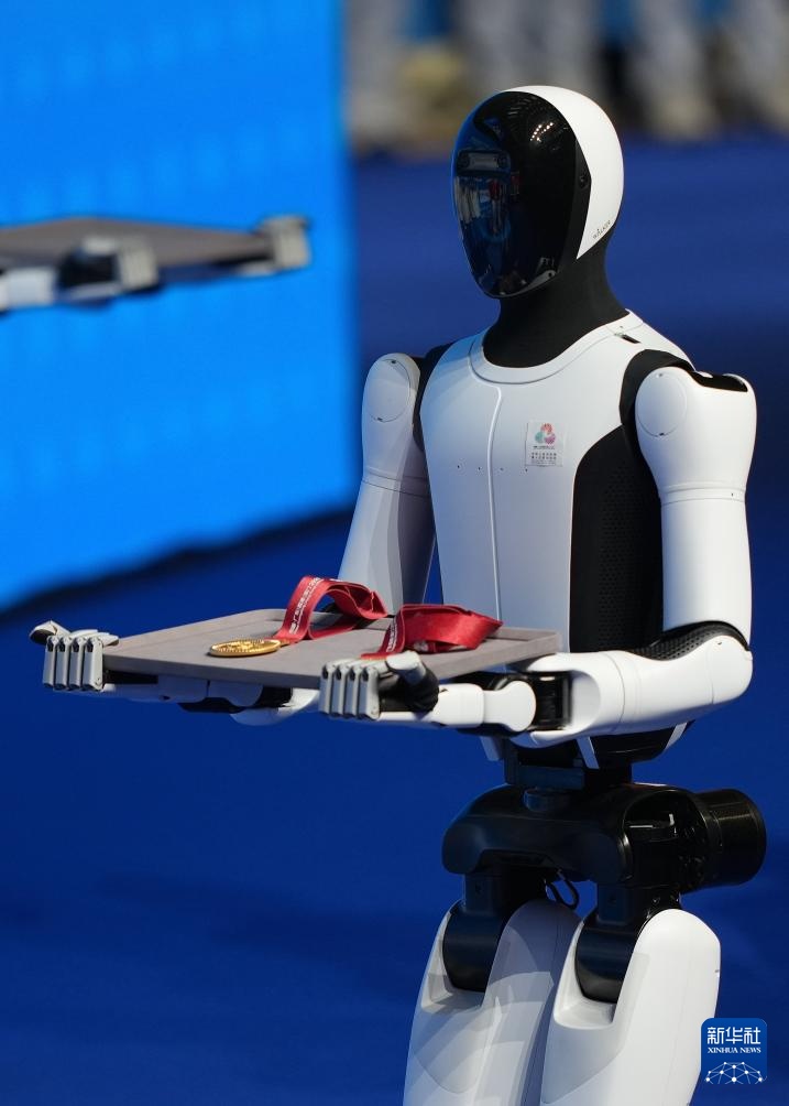 11月14日,人形机器人在颁奖仪式上手捧奖牌。