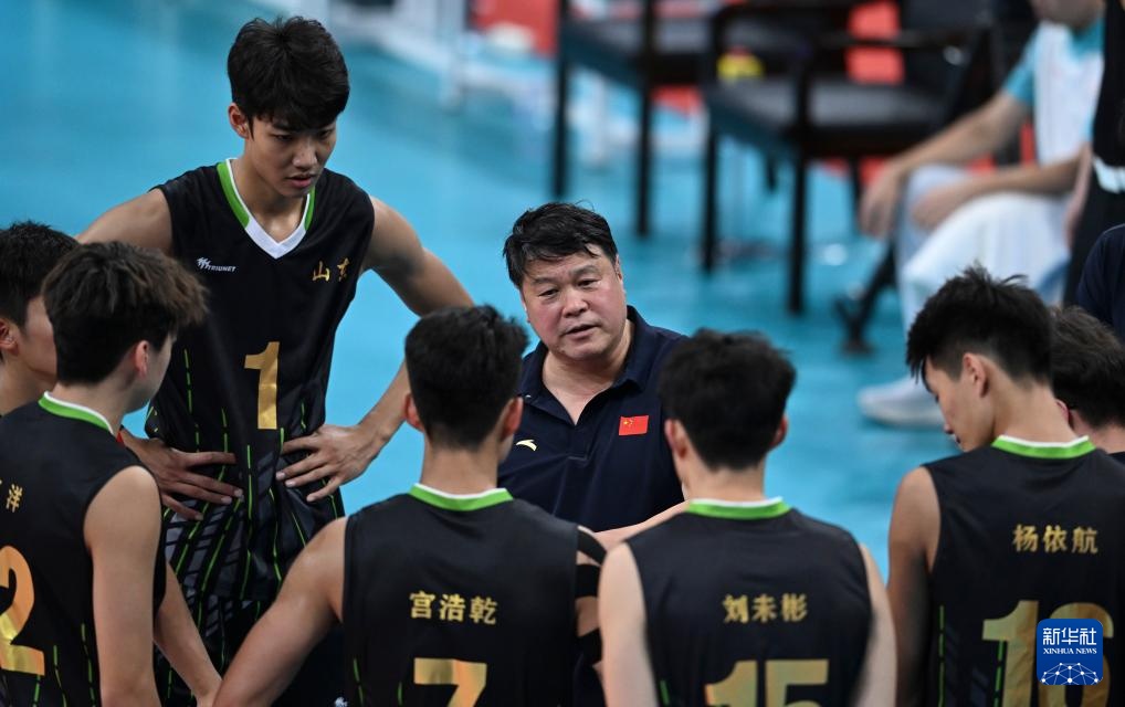11月14日,山东队教练辛春生(中)在比赛中布置战术。