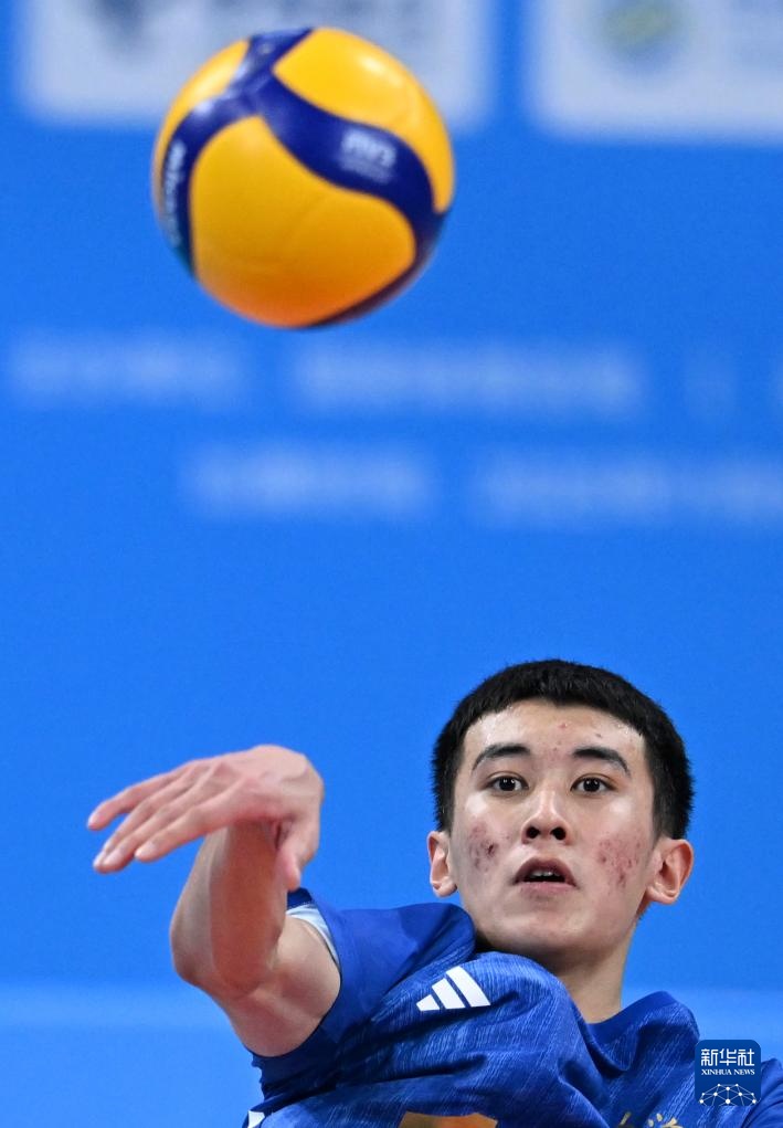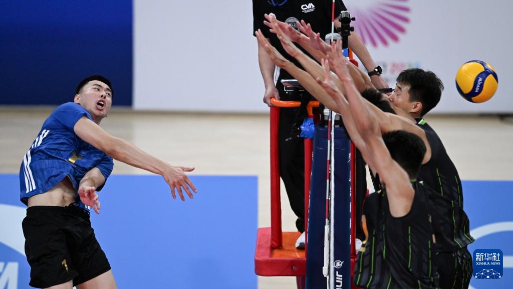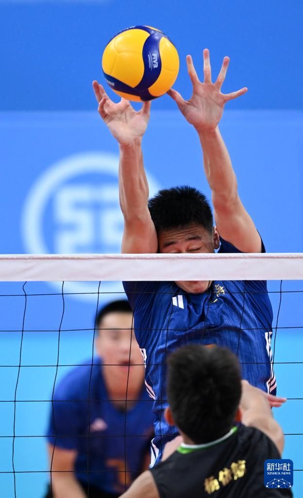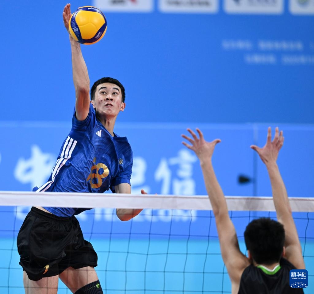 11月14日,山东队球员胡翰林(前右一)在比赛中扣球。