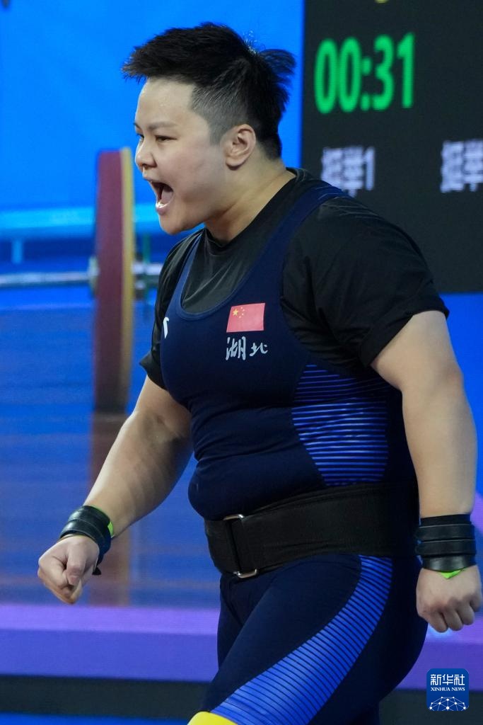 11月14日,湖北队选手汪周雨在抓举比赛中试举成功后庆祝。最终,她夺得冠军。