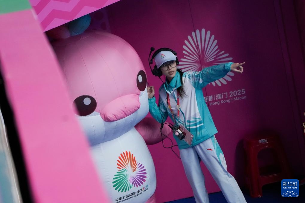 11月14日,志愿者和吉祥物“乐融融”在比赛前交流。