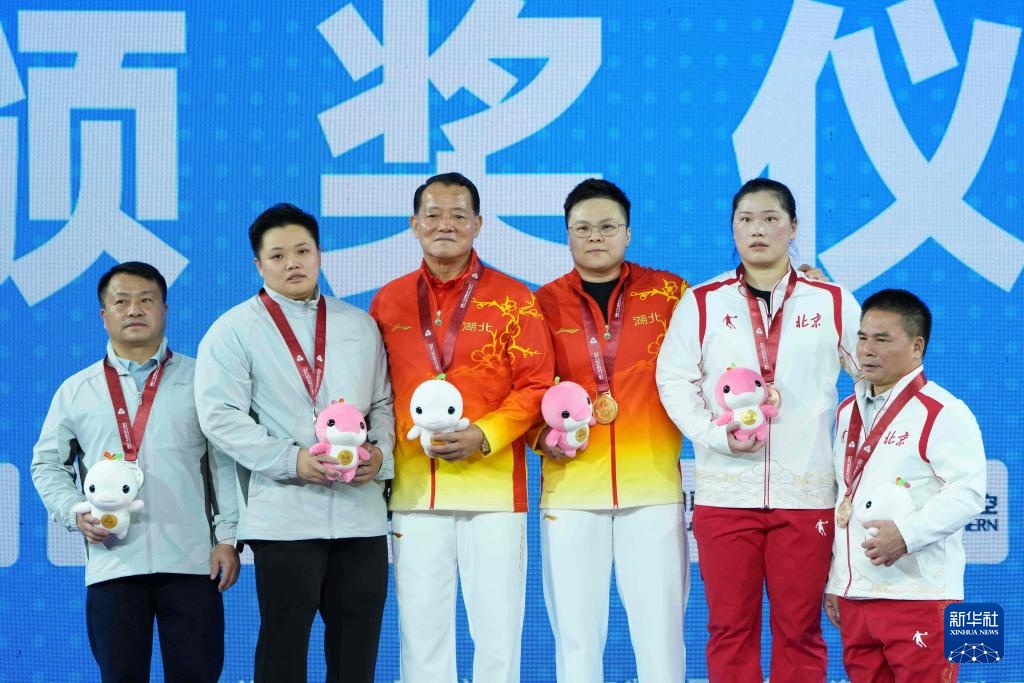 11月14日,获得冠军的湖北队选手汪周雨(右三)、获得亚军的个人参赛选手敖辉(左二)、获得季军的北京队选手鲍杨茜(右二)在颁奖仪式上与教练合影。
