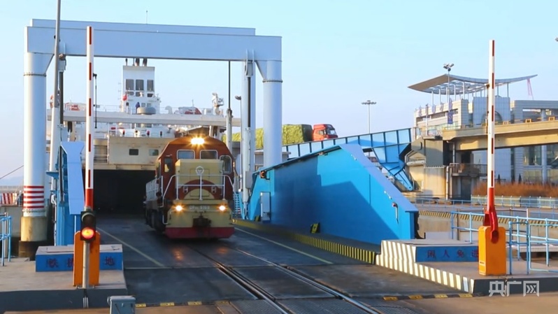 火车从中铁渤海轮渡缓缓驶出(央广网见习记者 易博闻 摄)