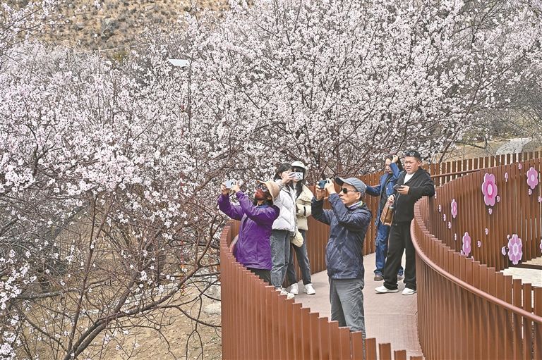 游客在林芝嘎拉桃花源拍照游玩。记者 次仁平措 摄
