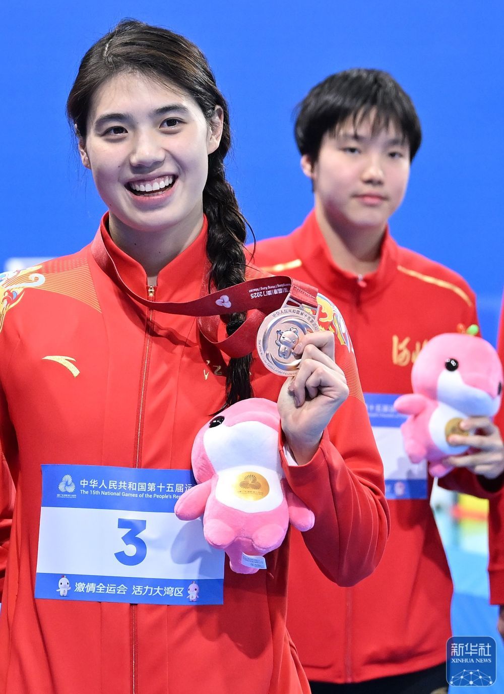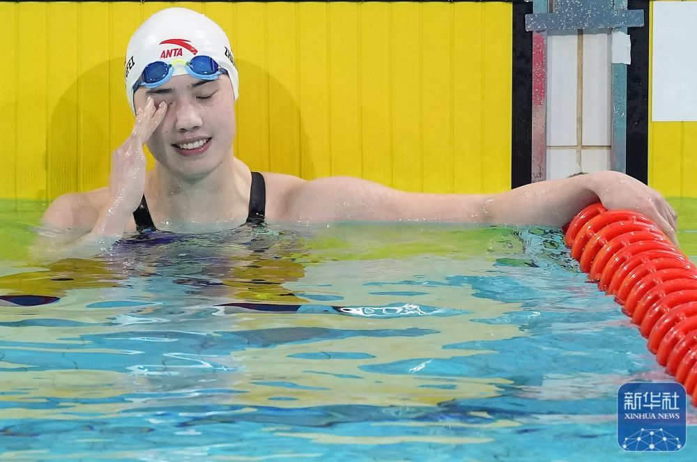 ↑ 江苏队选手张雨霏在比赛后。她获得季军。 新华社记者 杜宇 摄