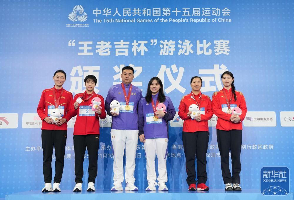 ↑ 冠军福建队选手陈露颖(右三)、亚军河北队选手于子迪(左二)、季军江苏队选手张雨霏(右一)和教练在颁奖仪式上合影。 新华社记者 薛宇舸 摄