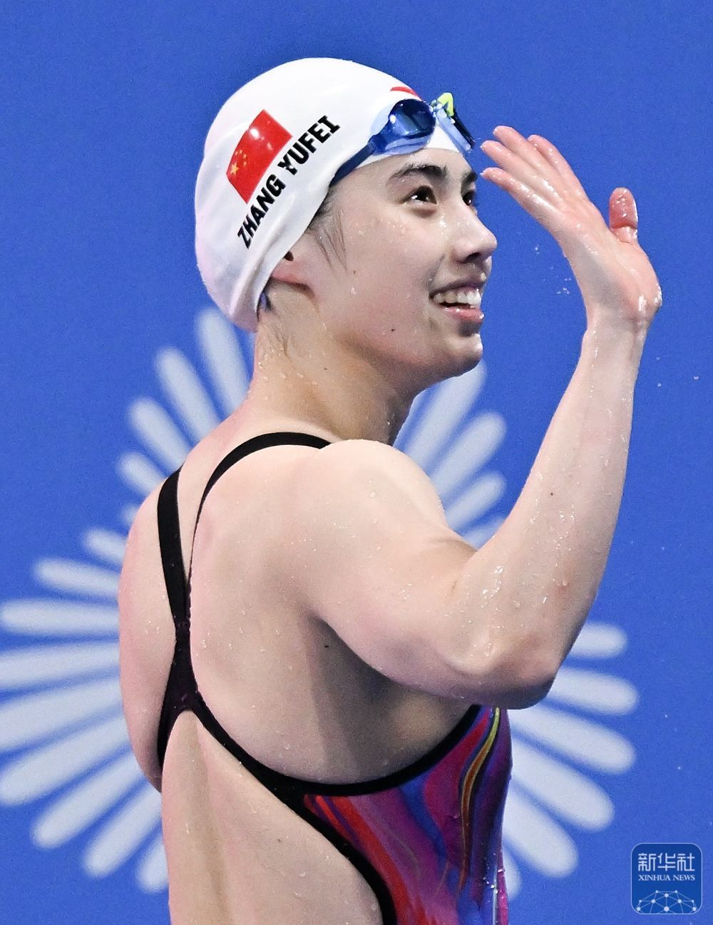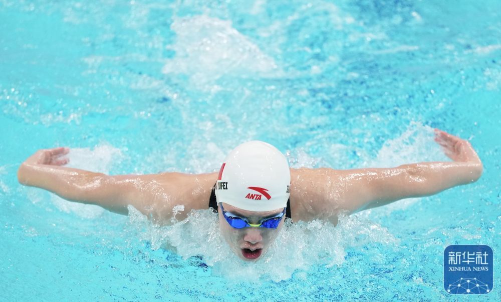 ↑ 江苏队选手张雨霏在比赛中。最终,她获得季军。 新华社记者 杜宇 摄