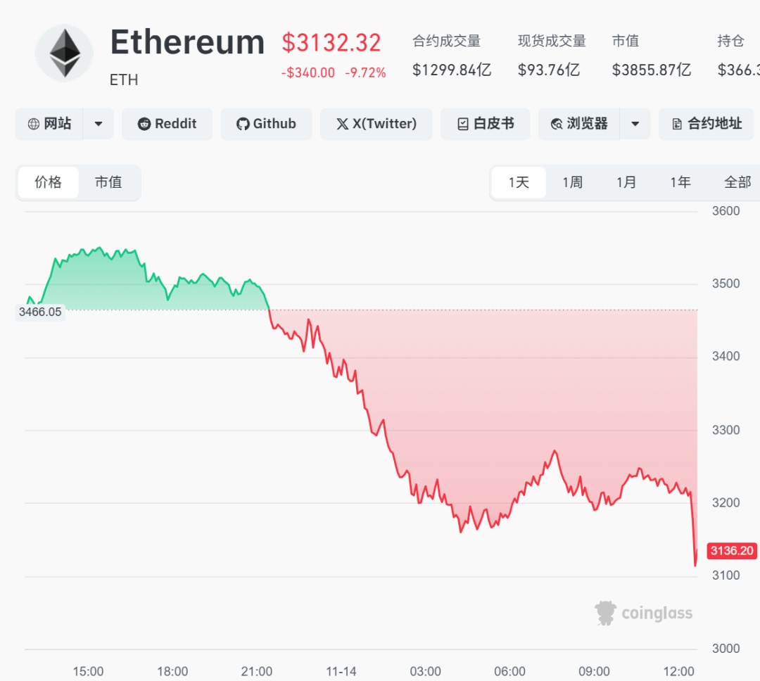 以太坊同样走低,日内逼近3100美元/枚,24小时内跌幅近10%。