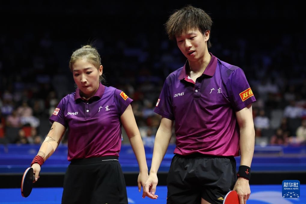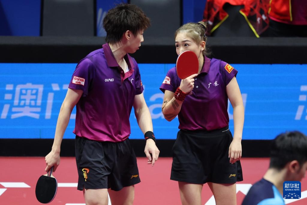 11月14日,广东队组合林高远/刘诗雯(左)在比赛中交流。