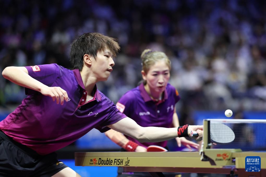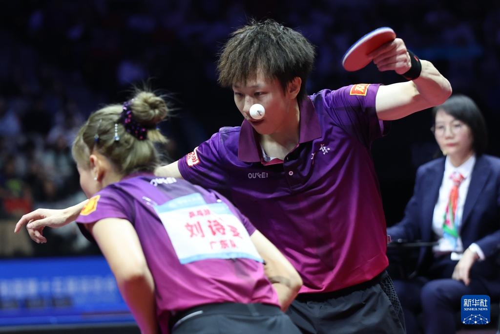 11月14日,广东队组合林高远(左)/刘诗雯在比赛中回球。