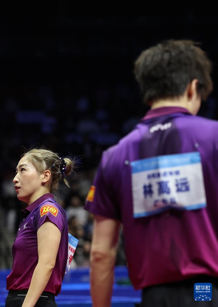 11月14日,广东队组合林高远(右)/刘诗雯在比赛中。