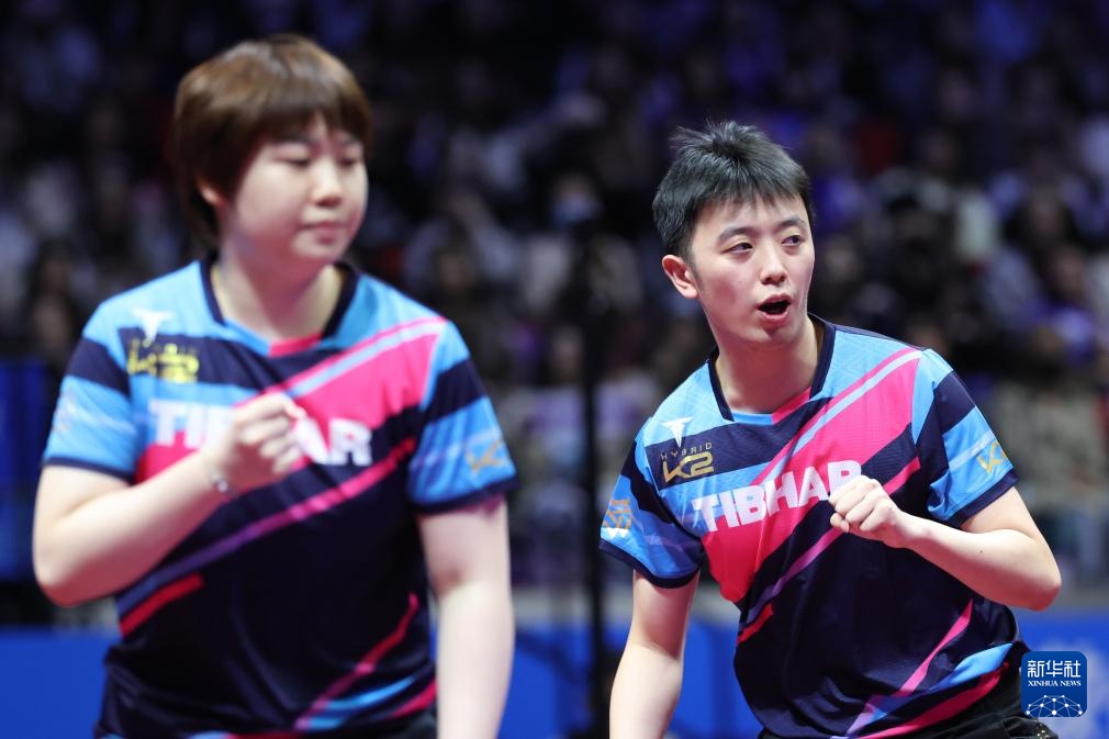 11月14日,广东队组合林高远/刘诗雯(左)在比赛中庆祝得分。