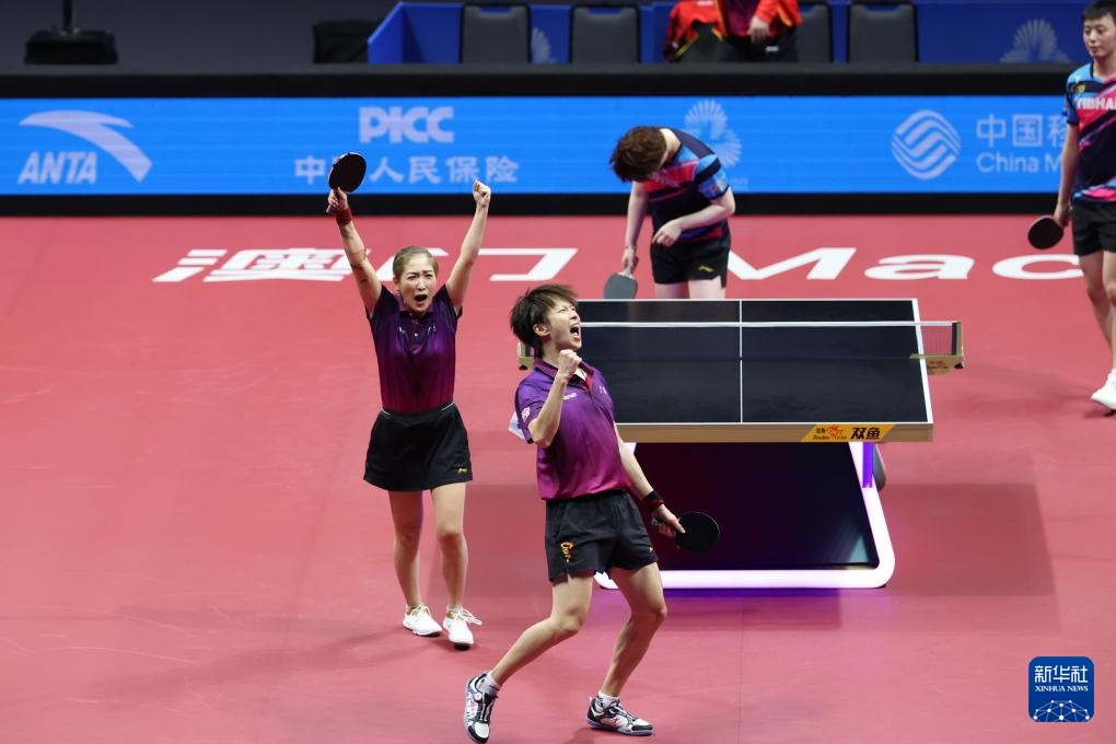 11月14日,广东队组合林高远(右)/刘诗雯在比赛后庆祝夺冠。