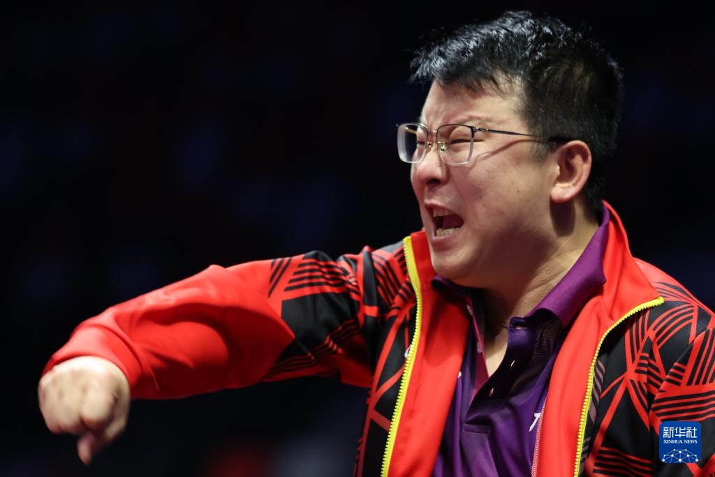 11月14日,广东队组合林高远(右)/刘诗雯(中)与教练张超在比赛后庆祝夺冠。