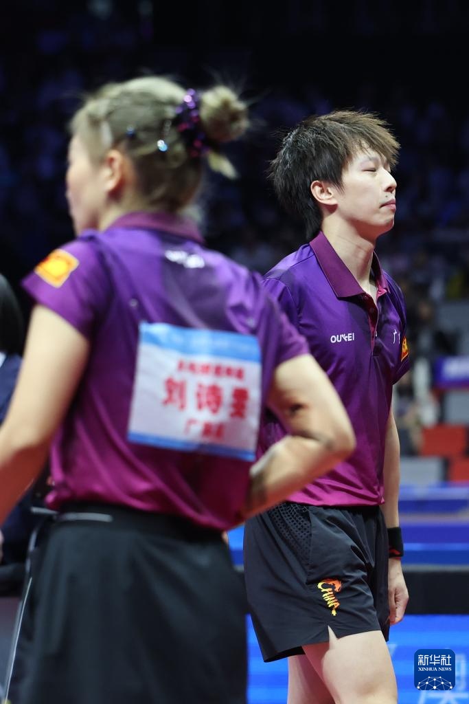 11月14日,广东队组合林高远(左)/刘诗雯在比赛中交流。