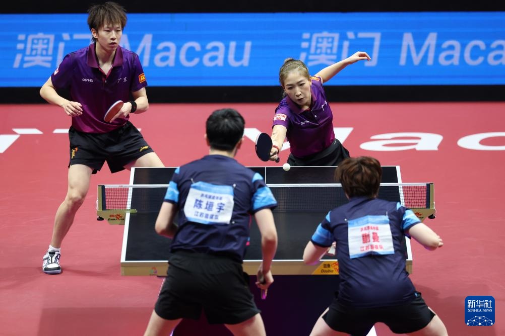 11月14日,江苏队组合陈垣宇/蒯曼(左)在比赛中回球。