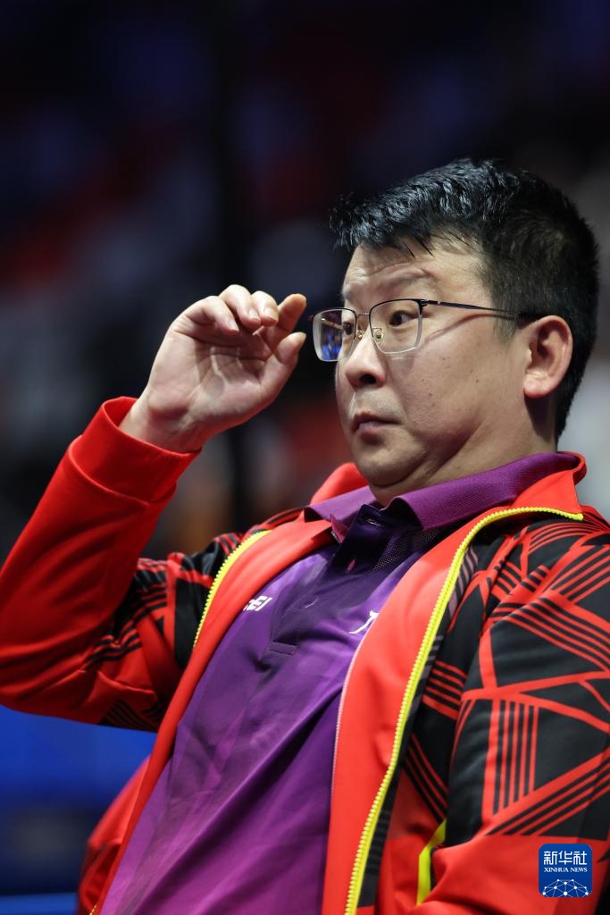 11月14日,获得冠军的广东队组合林高远(中)/刘诗雯(右)与教练在颁奖仪式上挥手致意。