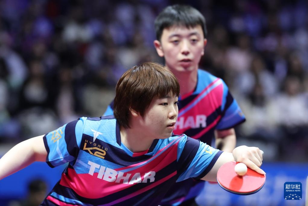 11月14日,广东队组合林高远(右)/刘诗雯在比赛中回球。