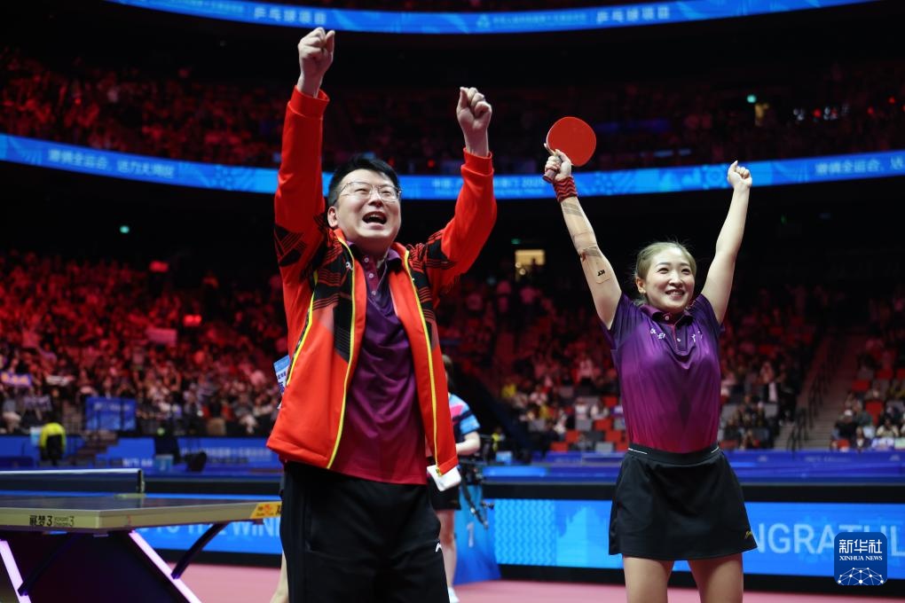 11月14日,广东队组合林高远(左)/刘诗雯庆祝夺冠。
