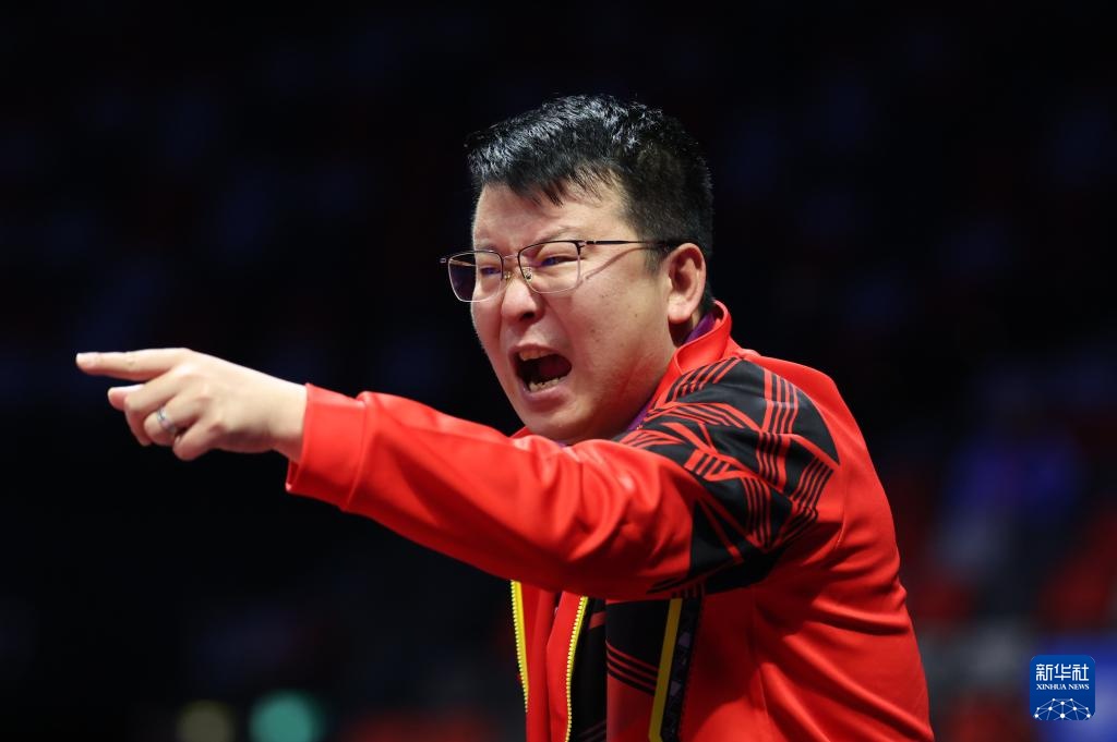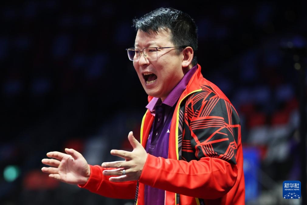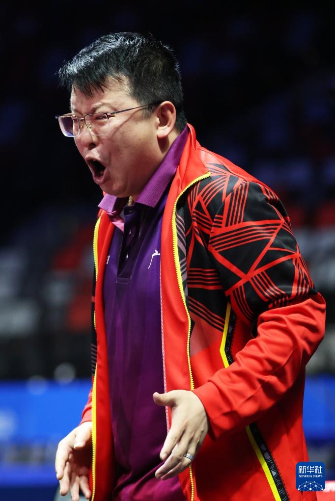 11月14日,广东队选手刘诗雯(右)在比赛间隙与教练张超交流。