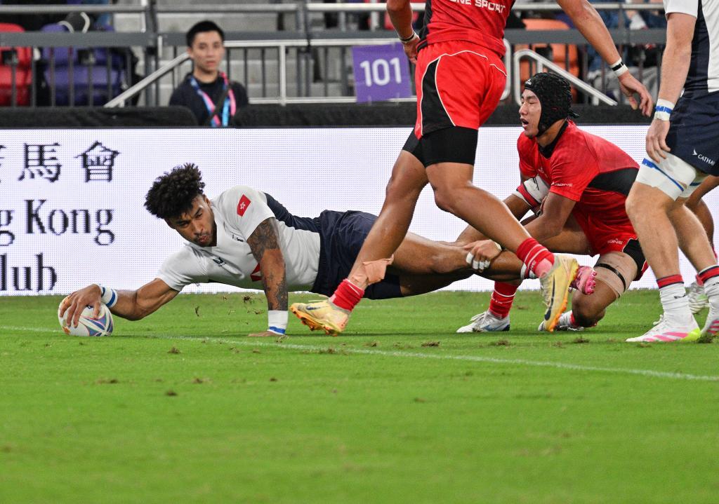 11月13日,香港队球员丹马克(左一)在比赛中进攻。当日,在香港举行的第十五届全国运动会7人制橄榄球男子小组循环赛中,香港队43:5战胜内蒙古队。新华社记者 陈铎 摄