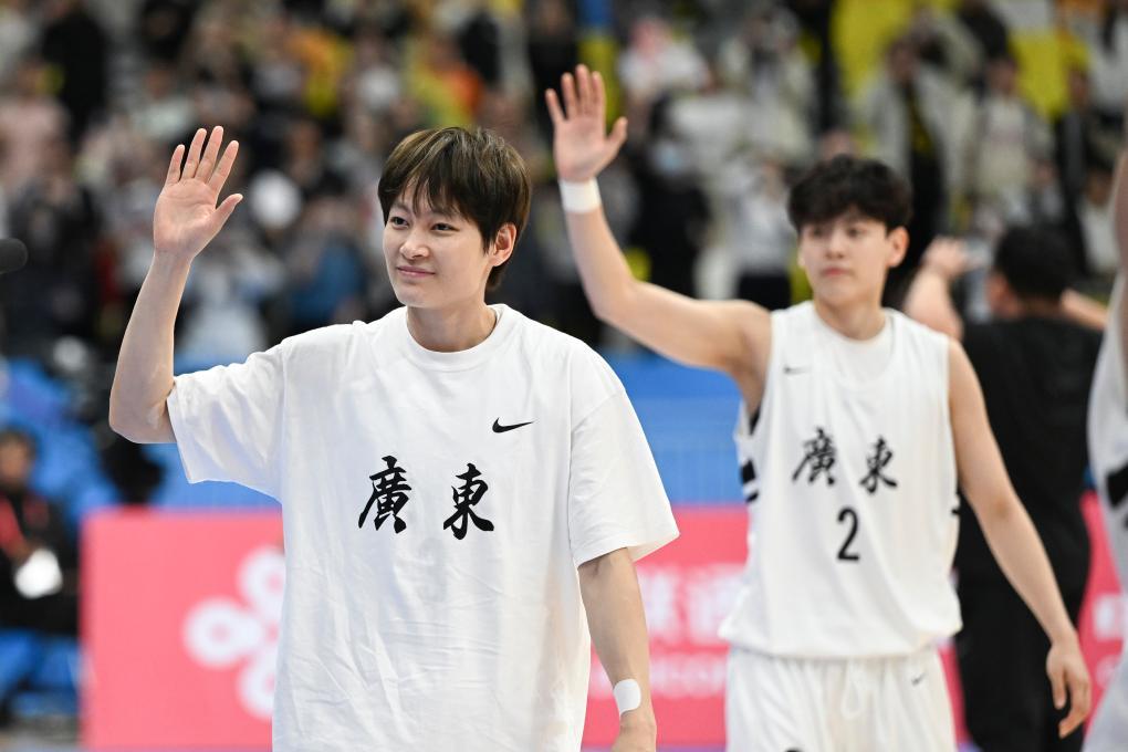 11月14日,广东队球员杨力维(左)与杨舒予在赛后向观众致意。当日,在佛山举行的第十五届全国运动会女篮半决赛中,广东队战胜辽宁队。新华社记者 邹竞一 摄