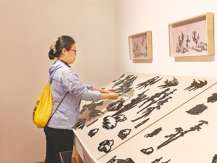 展览现场还有一件特殊的互动装置,名为《山水谱》。艺术家李邦耀将中国画的经典图式解构,把其中的山、石、树等基本元素转化为上百个独立的金属部件,观众可以在磁性展台上自由调度这些“模块”,构建属于自己的山水图景,大大增加了普通民众对于水墨艺术的创作兴趣,建立起水墨艺术与普通公众的文化共鸣。