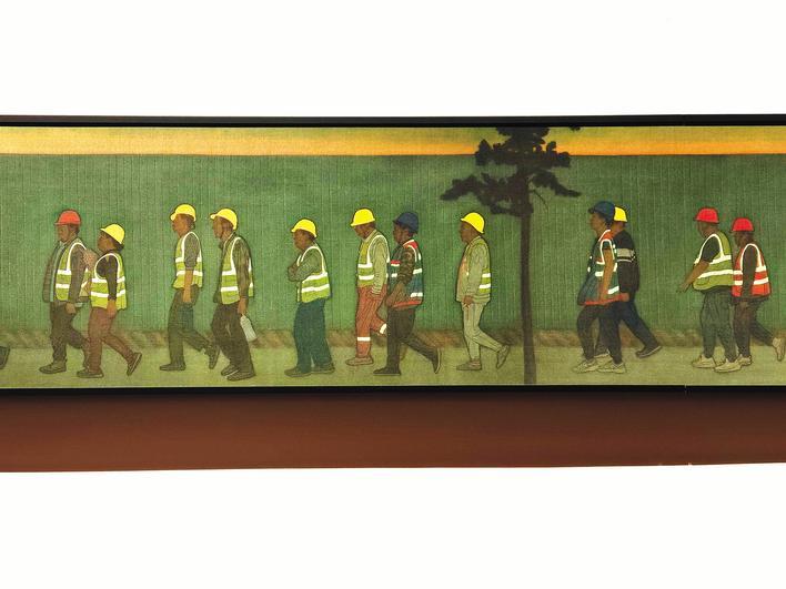 水墨与时代的接轨,也体现在艺术家以水墨艺术为载体,对人们现实生活进行书写和表达。在武汉美术馆(汉口馆)的2号展厅里,一幅长达8.6米的绢本工笔画占据了一整面展墙,令人瞩目。这幅画的作者是中国艺术研究院的国画院副院长李传真,她是一名湖北籍画家,专注于以农民工为题材的现实主义工笔人物画创作。这幅名为《晨昏线No.2》的作品就用传统工笔画法描绘了工人们在天光未明之时的混沌状态。