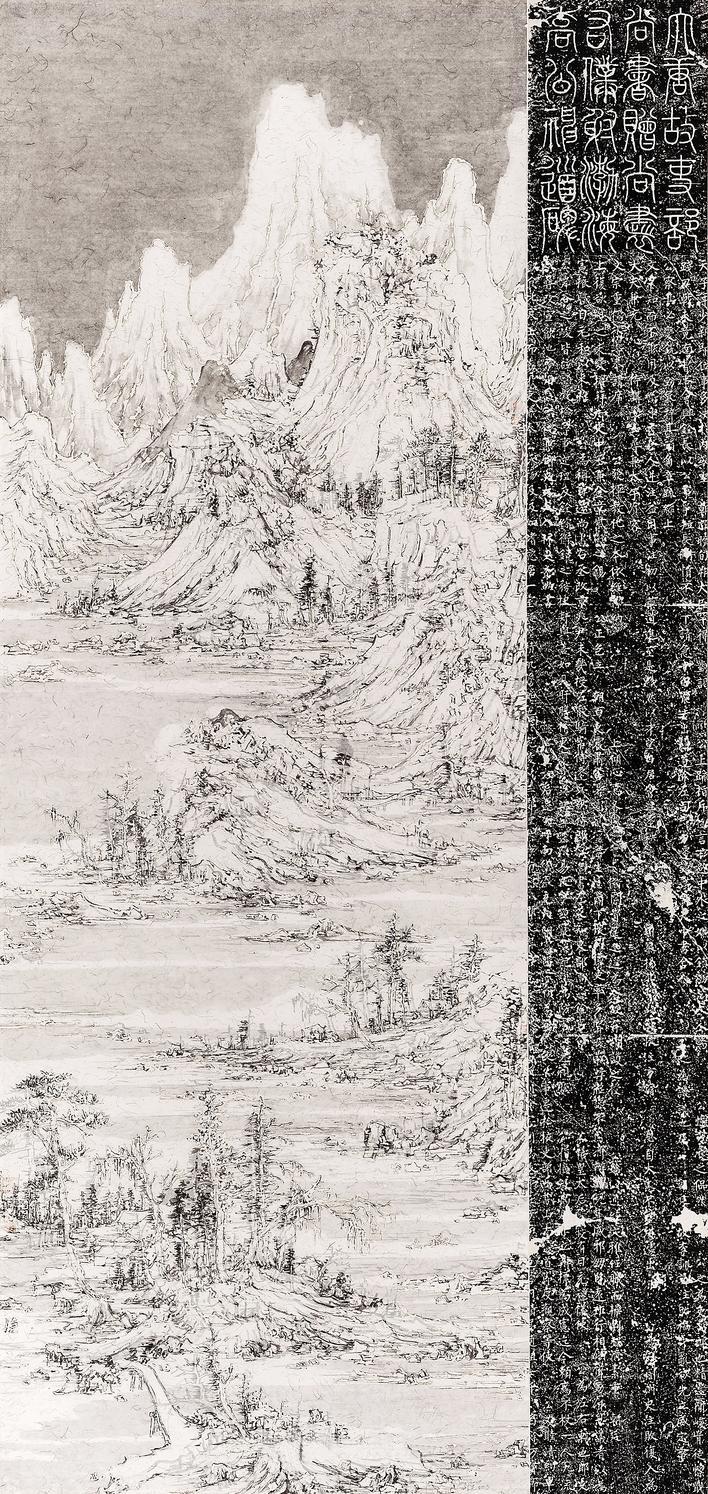 复旦大学教授王天德于2019年创作的《佘山抱水图》更是把水墨创作玩出了花样。这件在武汉美术馆(汉口馆)展出的作品右侧植入了清代拓片柳公权《高元裕碑》,用香烫的形式将山水与宣纸层层叠加,第一层画在画好后用香烫出痕迹,第二层画则透过香烫的孔洞展现出来,最后呈现出的是两层叠加的画面。山水图式与古代碑拓、墨迹相置,既反映了中国传统的审美特征,又产生了不同于传统的新鲜表达。