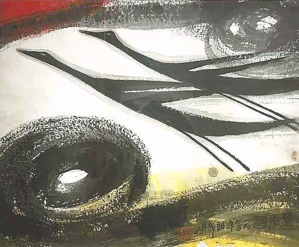 武汉美术馆的“水墨文章”展览就展出了一幅周韶华于1990年创作的《楚风图》,画中的主体是两只墨色的凤鸟相依相伴,周围的流云自在地飘拂,呈现出云卷云舒的意境。策展人荆菲介绍:“包括这幅《楚风图》在内的一批作品,周韶华先生都是从传统绘画里借用楚文化等元素,通过对这些元素的加工和转换,来进行当代水墨的创作。”
